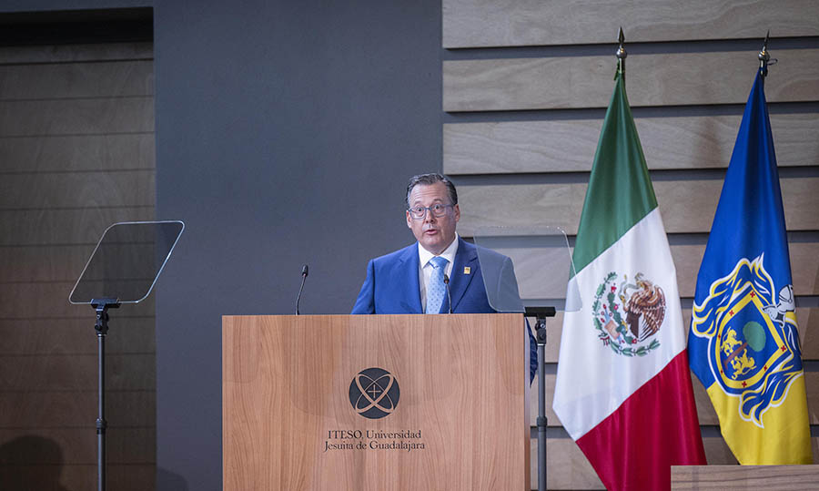 Es martes y todavía se sienten los efectos de la lluvia de la noche anterior. En el nuevo auditorio están congregadas autoridades del ITESO, de la Compañía de Jesús, así como representantes de gobierno y de la comunidad universitaria. La ceremonia para inaugurar el nuevo edificio del campus es conducida por Mónica Durán Labrador, directora de la Prepa ITESO, y por Carlos Araujo, exdirector del bachillerato y actual director de la Oficina de Educación Continua. Ceden la palabra a Guillermo Gatt Corona, quien, dice, da la bienvenida a las y los asistentes “como presidente de ITESO, AC, pero también como egresado y profesor”. Después menciona que con la apertura del nuevo edificio el campus se consolida como uno “de los mejor equipados, seguros y sostenibles de México”. El diseño del arquitecto Javier Díaz, dice Gatt Corona, “es un orgullo como itesianos y como jaliscienses”.